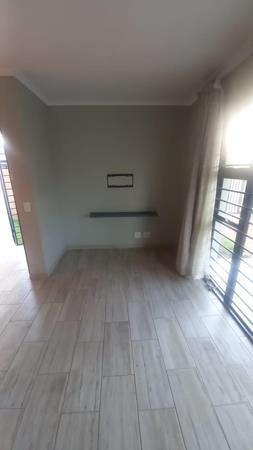 The house offers an open plan living concept from the generously sized lounge and dining area, one is ushered into a kitchen with an electric hob and an under counter oven. The kitchen has ample cupboard space, Caesar stone countertops and makes provision for a big refrigerator. There is a glass sliding door that opens into the yard with a braai facility.