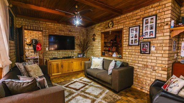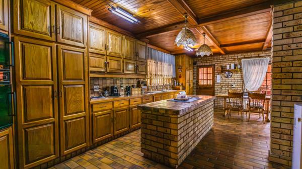 Step inside to discover a warm, rustic ambiance defined by extensive exposed brick walls, rich wooden paneled ceilings, and durable tiled flooring throughout. The open-plan living and kitchen areas foster a sense of spaciousness, benefiting from natural light filtering through large windows. The kitchen is a focal point, boasting extensive wooden cabinetry, a practical island, and a dedicated dining space, creating a cozy yet functional heart for the home.