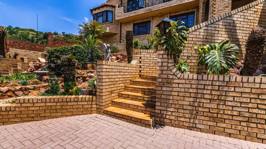 This distinctive multi-level brick residence in Magalieskruin, Pretoria, immediately captivates with its unique architectural design and ornate terraced gardens. The property presents a substantial and aesthetically rich exterior, featuring decorative fountains, statues, and lush landscaping. Multiple balconies offer potential views, while a spacious paved driveway leads to a double garage, providing ample parking and kerb appeal.