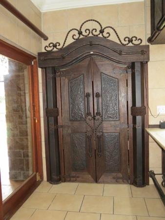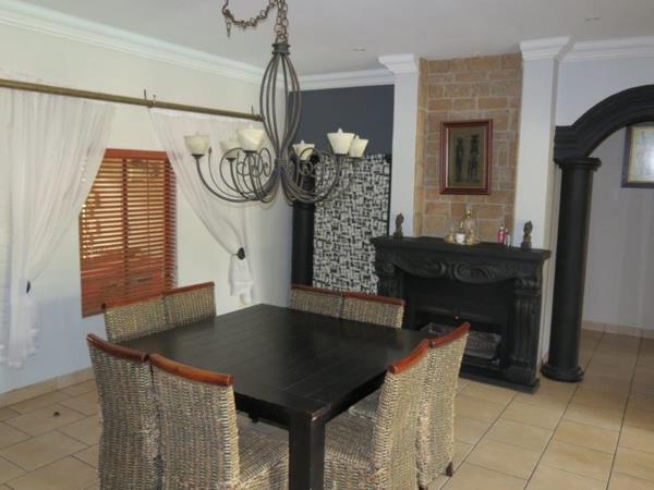 oEnclosed entertainment area with a built-in braai, seamlessly connected to the dining room featuring a cozy fireplace.