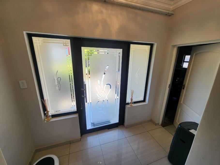 Stunning 4 bedroom home, with 3 bathrooms. There is a guest bedroom downstairs en-suite as well as a guest toilet. The other 3 bedrooms are upstairs. The main bedroom is en-suite with a dressing room, and a balcony. Lovely entrance area, open plan lounge and dining room, stunning kitchen with a scullery and granite tops. There is lots of built-in cupboards for storage in the double automated garages and an outside toilet. The home has a big garden and a patio with a braai.
