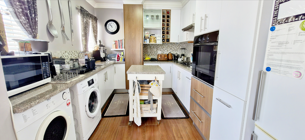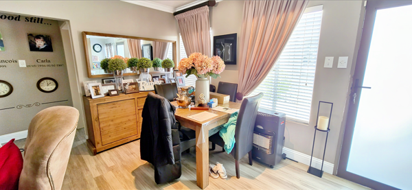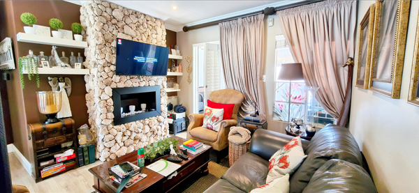 Open plan living and dining room with fire place which walks out to the covered patio enclosed with canvas covers and built-in braai. Kitchen is modern with an added island.