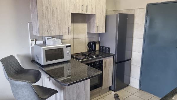 - A well-equipped kitchen with built-in cupboards, an oven, and a hob
