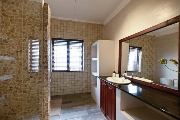 The lounge, complete with a built-in wall unit and cozy fireplace, flows seamlessly into the dining and bar area, where laughter and conversation come naturally. Just beyond lies the enclosed entertainment patio with a built-in braai, overlooking a heated swimming pool the perfect setting for unforgettable weekends and relaxed summer evenings.