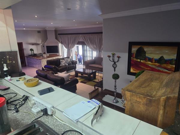 The lounge walking out on a lovely patio and sparkling pool. Indoor braai! Boma braai outside as well.