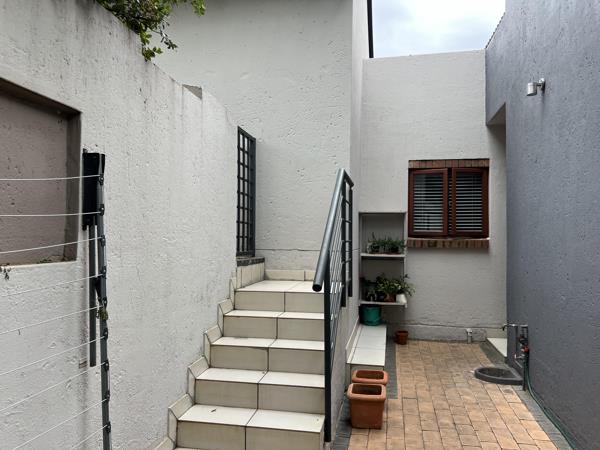 Enclosed patio with a build-in braai. Stackable doors that opens up to a well maintained garden with sprinklers and outside storage.