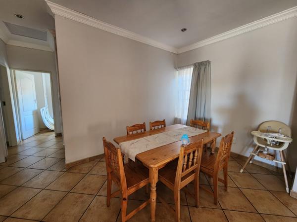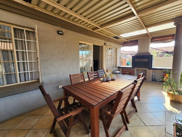The kitchen boasts plenty of cupboard space, an eye level oven, granite countertops, scullery, and a breakfast nook. Well-suited for entertaining guests is a sizable covered patio with a built-in braai. Down the hallway are 3 large bedrooms with built-in closets and 2 fully-tiled bathrooms, one of which is the master en-suite.