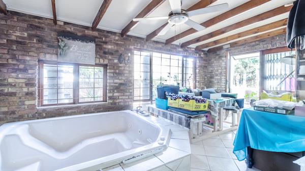 The kitchen offers a separate scullery and is connected to a dining room and also the entertainment area. The entertainment area offers a jacuzzi, built-in braai and fireplace.