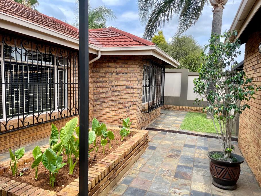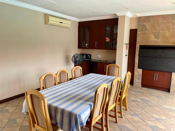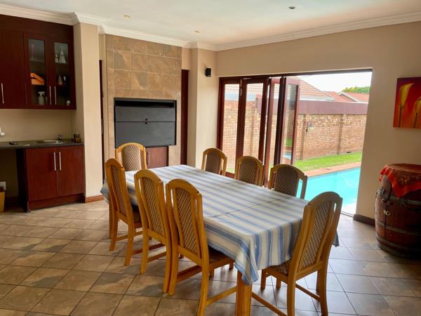 The entertainment amenities are a standout feature. A lapa with a built-in braai opens through sliding doors to the swimming pool, creating a seamless connection between indoor and outdoor living. A pizza oven adds an additional touch for hosting family and friends.
