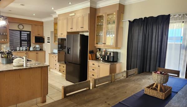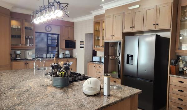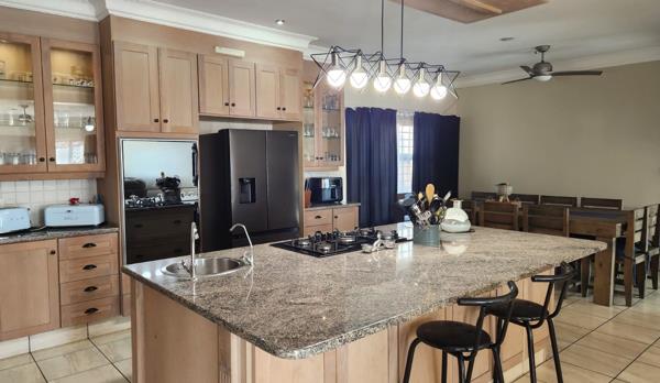The open plan living area is spacious with enough room for a dining room and lounge. A luxurious kitchen with durable granite counter tops, perfect design, island with breakfast bar and enough storage and is complimented by a full scullery.