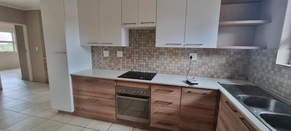 The kitchen is well equipped with built-in cupboards, an electric stove and oven, a washing