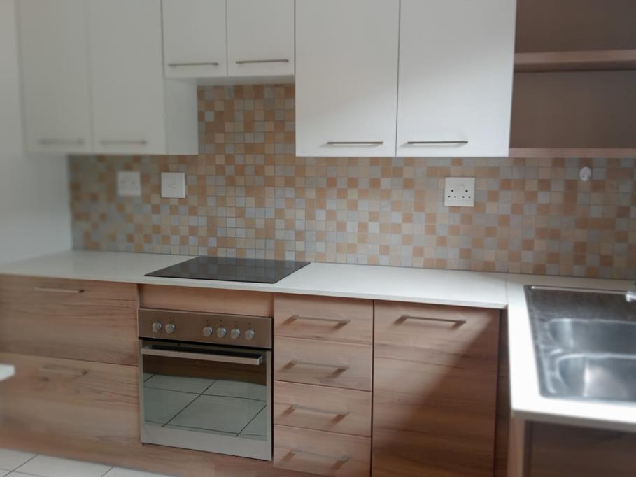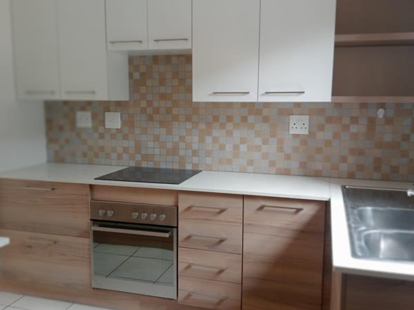 The kitchen is well equipped with built-in cupboards, an electric stove and oven, a washing