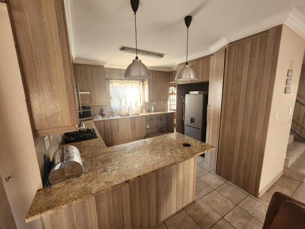 Downstairs you''ll find a modern open plan kitchen with a gas hob, electric oven, breakfast nook, pantry and scullery. There is an open plan dining room and lounge with stack-away doors opening up to a patio with a built-in braai.