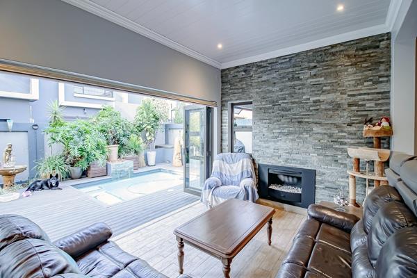 Adjacent to the living area, youll find an elegant built-in bar and braai space, perfect for gatherings. This area flows beautifully to the poolside deck and includes additional seating/dining room or a versatile study area. A cozy gas fireplace completes the main lounge, adding warmth and ambiance.