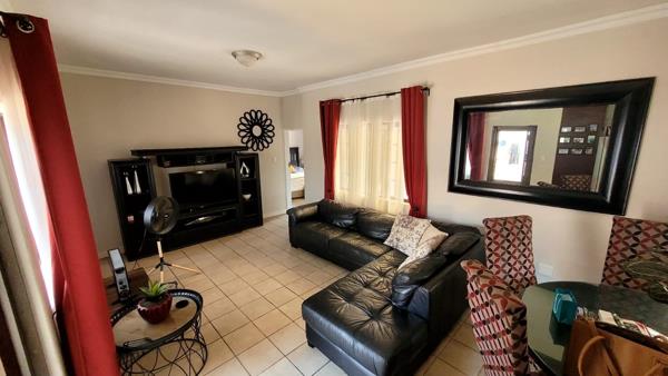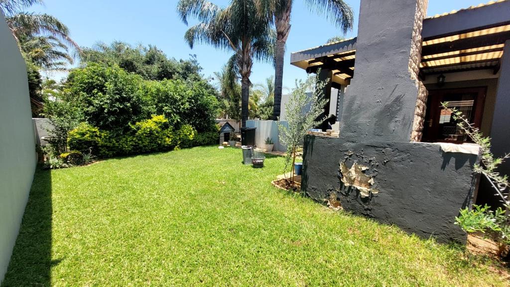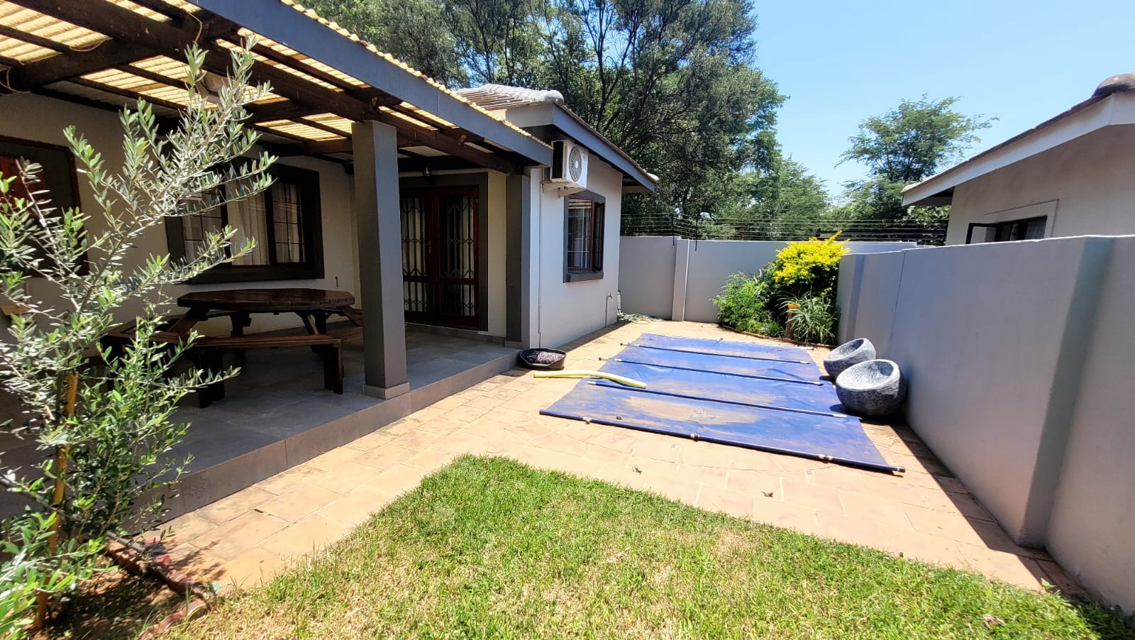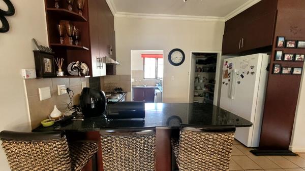 This prime property is perfect for retired couples or a starter family. 2 spacious bedrooms with lots of cupboard space with 2 en-suites. Fully laminated bedrooms. Open plan lounge and dining overlooking a fabulous kitchen with granite tops, red cherrywood cupboards, oven and hob, extractor fan, spens and a separate scullery. Covered patio with a built-in braai, space for lounging chairs, sparkling pool and lots of luscious green garden. Double garage and 2 open parkings.