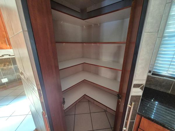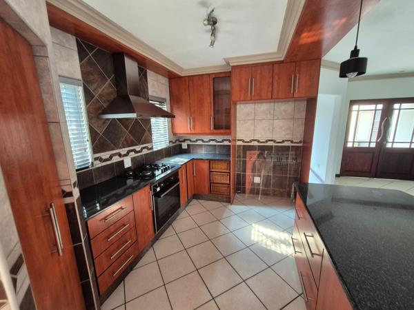 Downstairs, a modern open-plan kitchen with granite countertops, a pantry, and a scullery seamlessly flows into a spacious dining room and lounge. An enclosed braai area with a jacuzzi adds to the homes entertainment appeal.