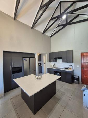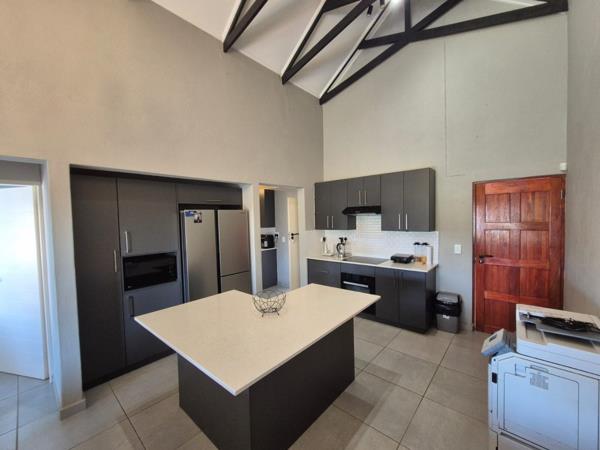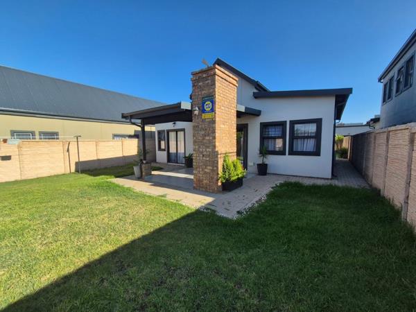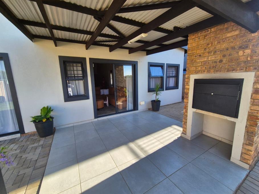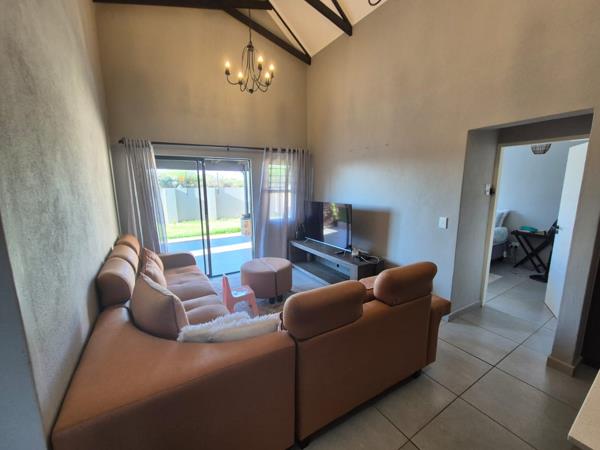 The home features 3 spacious bedrooms and 2 full bathrooms, including a main en-suite. The stunning open-plan kitchen includes a breakfast nook, scullery, and sleek granite countertops, seamlessly flowing into the living area. Sliding doors lead to a covered patio with a built-in braai, perfect for relaxed entertaining.