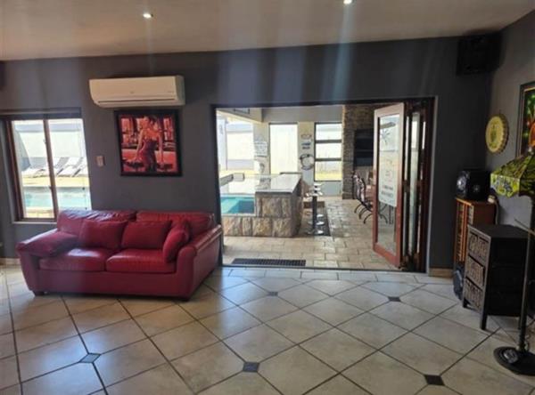 The homes outdoor entertainment area is a true highlight featuring a covered patio with a built-in bar, sparkling swimming pool with its own bar section, and a relaxing jacuzzi, ideal for weekend braais and sunset get-togethers.