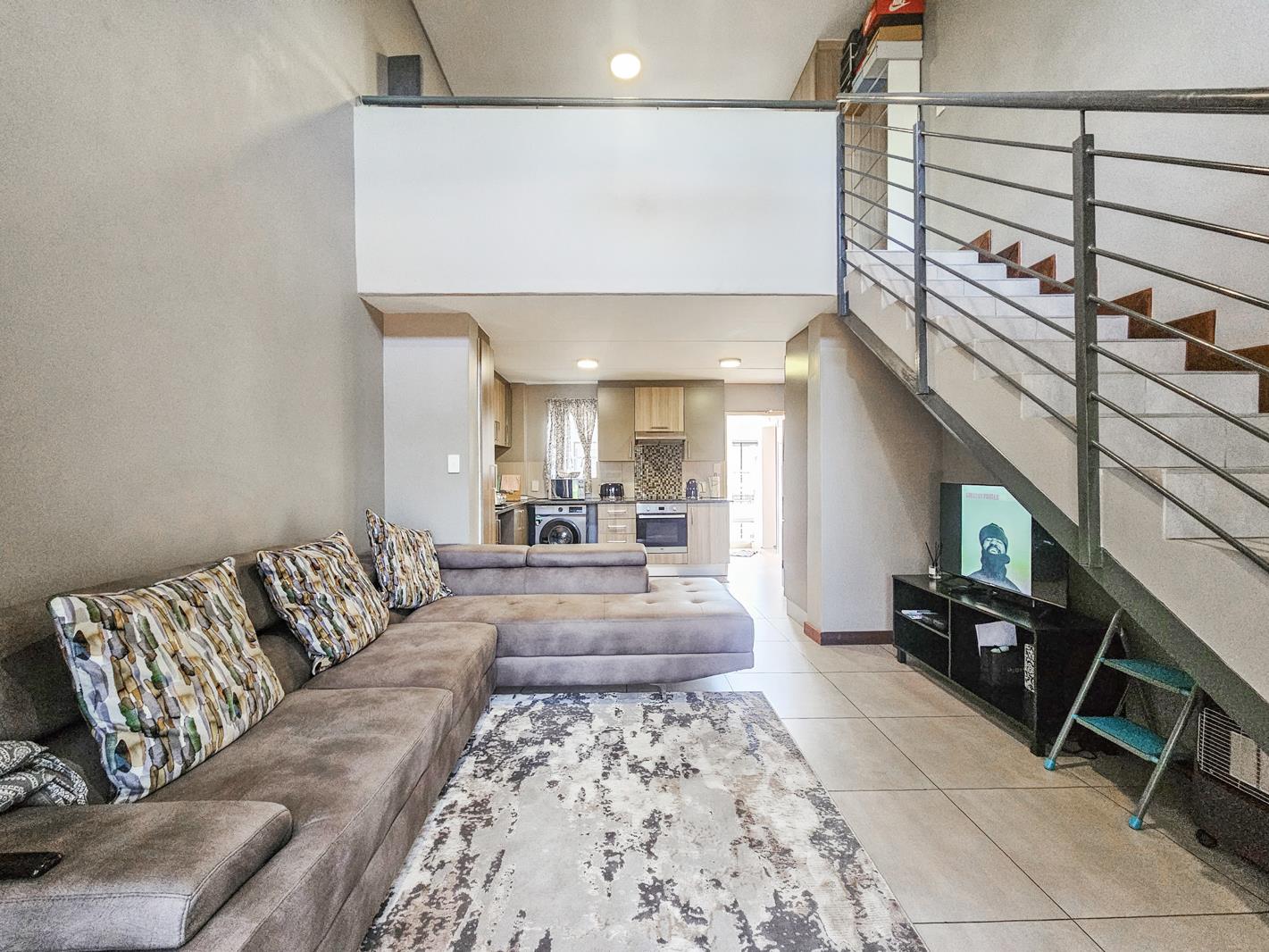 Open-plan lounge and kitchen flowing to a private patiobalcony accessed via stairs