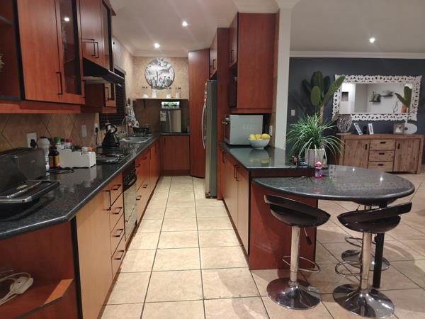Stylish Kitchen with cherry royal cupboards, granite tops, breakfast nook, pantry & extractor fan.