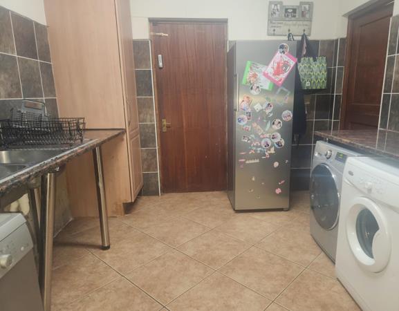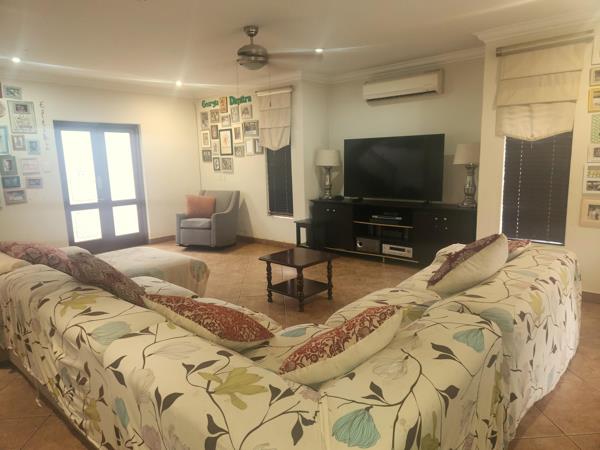 The double storey home welcomes you through a lovely, covered patio with built in braai, facing the swimming pool.