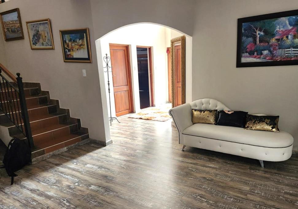 The double storey home welcomes you through a lovely, double wooden front door into the double volume entrance hall with direct access to the garage housing 4 vehicles, and the guest WC.