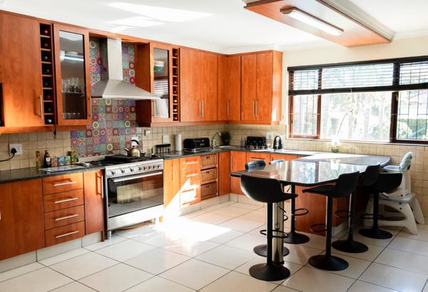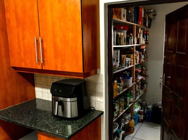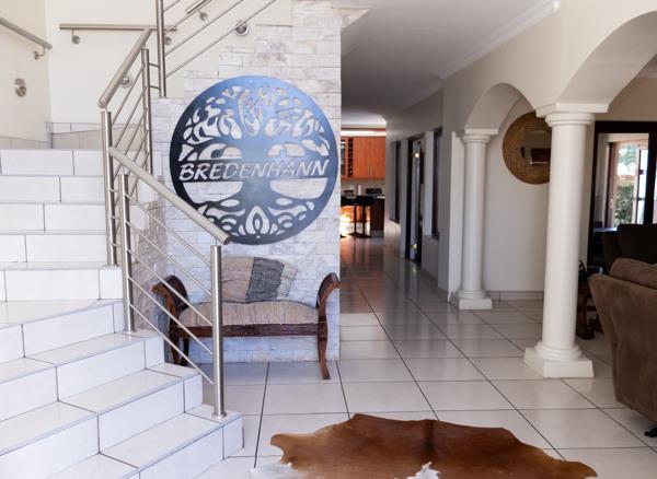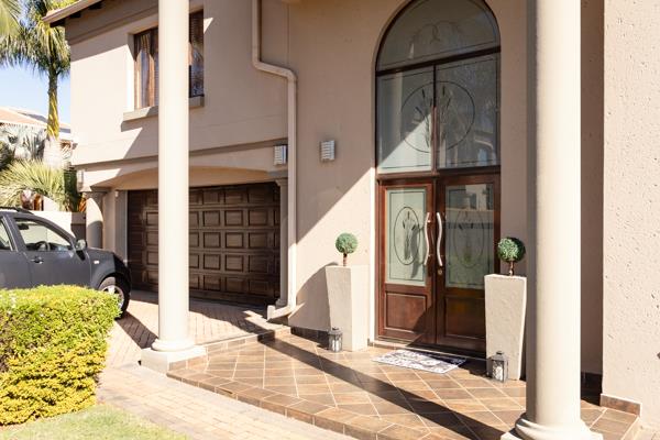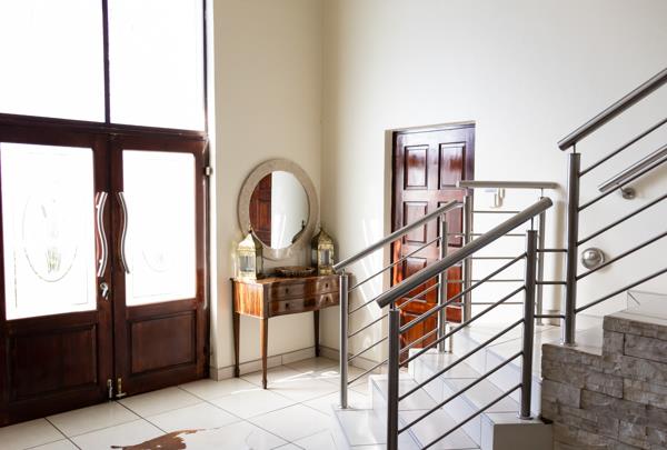 Entering through a huge, wood, glass and aluminium front door, you enter an impressive double volume entrance area with direct access to the double garage, the stairway and the rest of the downstairs living area. The lounge area, dining area and a beautiful, modern kitchen with durable granite counter tops, loads of storage, a gas stove, separate scullery and a pantry and a few extra nooks and crannies will impress. Through the dining room, double wooden doors opens onto a lovely covered patio with a built in braai. Huge doors, again open onto a louvered patio, the leafy back yard and the welcoming swimming pool.