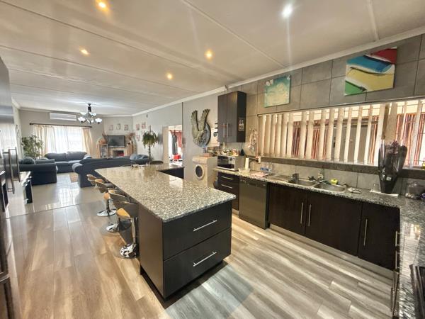 The main house features 4 bedrooms and 2 bathrooms (including one en-suite). The open-plan kitchen flows into a TV room, while a spacious lounge welcomes you upon entry. For entertaining, there is an inviting outdoor braai area, a built-in bar, and a linen cupboard in the passage. The main house also includes 2 garages.
