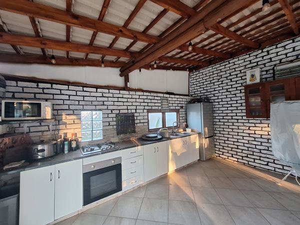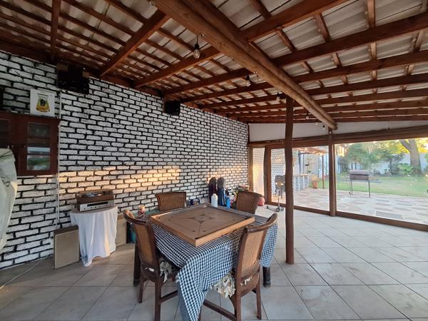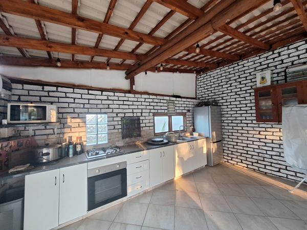 Outdoor Area: Enclosed entertainment building with kitchenette, gas stove, electric oven, built-in braai, and guest toilet.