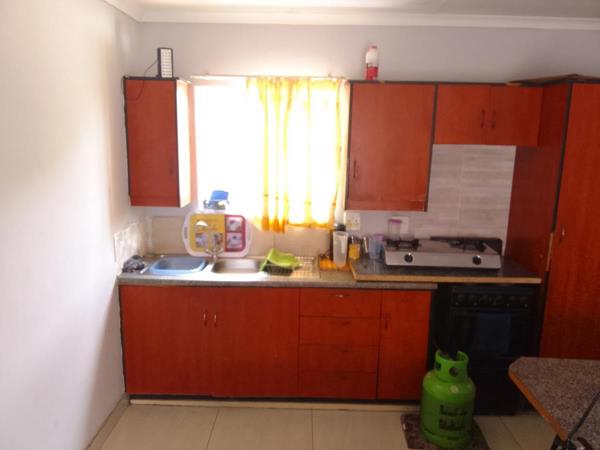 Kitchen: Fully equipped open-plan kitchen with built-in cupboards, stove, and space for a fridge.