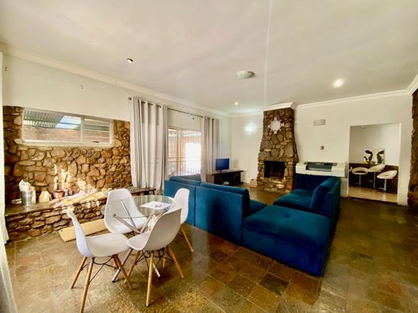 Large living area with a cozy fireplace, opening up to a patio with built-in braai perfect for entertaining