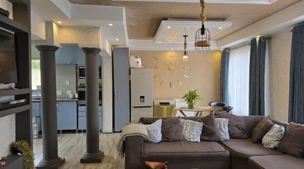 The house offers an open plan living concept from the generously sized lounge and dining area, one is ushered into a modern and spacious kitchen with an electric hob, an under counter electric oven, modern countertops and dedicated space for a double door refrigerator.