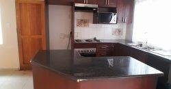 The interior boasts a functional and modern kitchen, equipped with dark wooden cabinetry, sleek dark granite-look countertops, and essential built-in appliances including an oven, stove, and microwave. A practical kitchen island doubles as a breakfast bar, creating an open-plan flow into the living area, ideal for both daily living and entertaining. Natural light streams in through a window fitted with security bars, ensuring peace of mind.