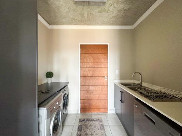 The ground floor features an open-plan living area and kitchen, designed for easy flow and effortless entertaining. The stunning kitchen is fitted with a centre island that houses the stove and oven, ample cupboard space, and a separate scullery for added convenience. A guest toilet is situated near the entrance on the lower level.