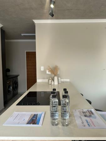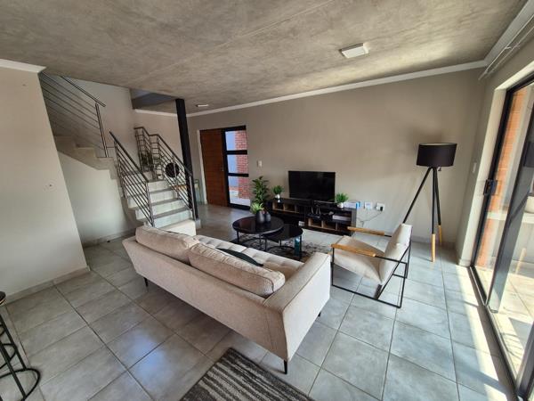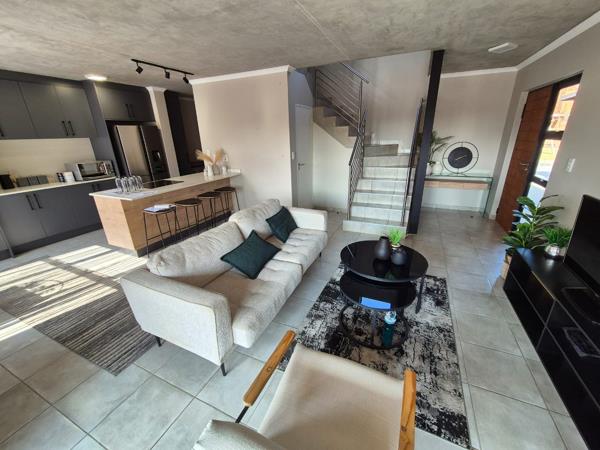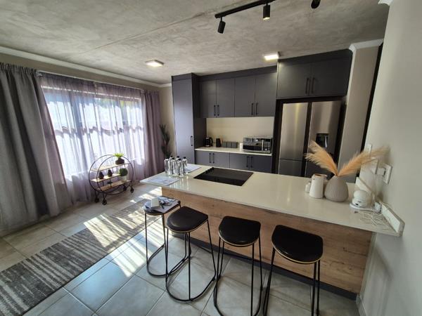 Downstairs, enjoy a modern open-plan kitchen with Caesarstone countertops, breakfast nook, and separate scullery. The living and dining area flows effortlessly to a covered patio with a built-in braai, overlooking a private gardenyour own space for entertaining or relaxing.