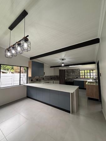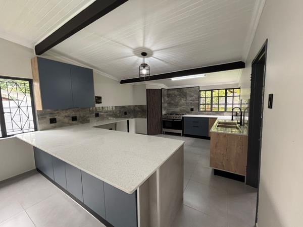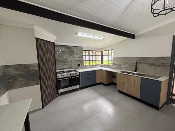 Upon entry, the interior reveals an open-plan design, seamlessly integrating the lounge, dining room, and a newly renovated kitchen. The kitchen is a focal point, boasting an expansive island, sleek blue-grey and wood-accented cabinetry, and light speckled countertops. Equipped with a new gas range and double sink, it is further enhanced by contemporary industrial pendant lighting and high planked ceilings with exposed black beams, all illuminated by abundant natural light from large windows.