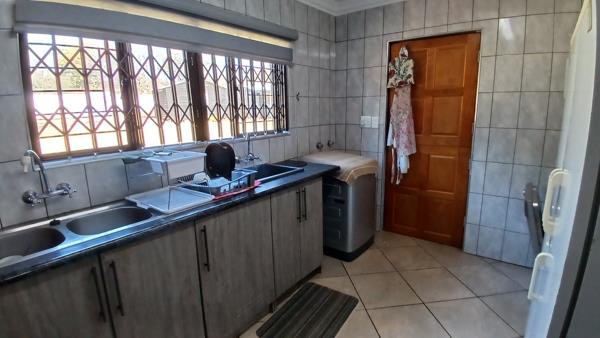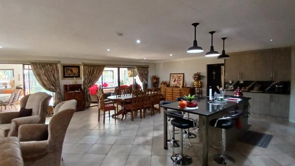 * Spacious 4 bedroom, 2 bathroom, (1 en suite). Open plan lounge with kitchen and Bar. 5th Utility room. Lapa, Bar, large pool with big Boma/Braai area. Beautiful gardens/ 4 car garage / 5 carports in total. Full trellidor / beams / alarms.