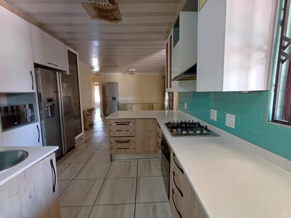 The property features an open-plan living and dining area that flows seamlessly into a modern, newly renovated kitchen. The kitchen is fitted with a gas stove, scullery, an additional sink and provides space for a double-door refrigerator.