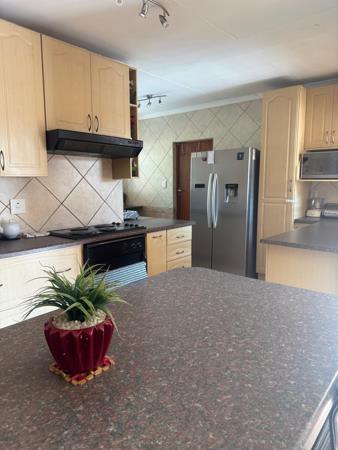 On the outside, an enclosed patio with a built-in braai leads to a sparkling swimming pool, surrounded by a meticulously maintained garden adorned with a tranquil water fountain an ideal setting for relaxing or hosting guests.