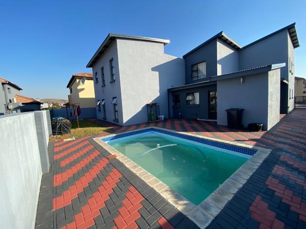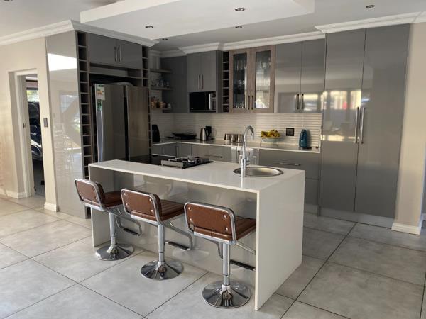 5 bedrooms, fully fitted with modern built-in robes, 4 bedrooms are en-suite. When entering through the main entrance you come across the lounge, which is an open plan leading you to the dining room, then to the private tv room. There''s a fireplace in both TV room and dining room. Then we are led to our lovely kitchen with modern finishes, electrical stove as well as a gas stove to accommodate the load shedding, separate scullery, guest toilet.
