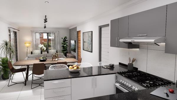 3 bedrooms fitted with built-in cupboards of your choice, 2 bathrooms (ensuite with double vanity), and an open-plan kitchen flowing to the dining area and lounge.