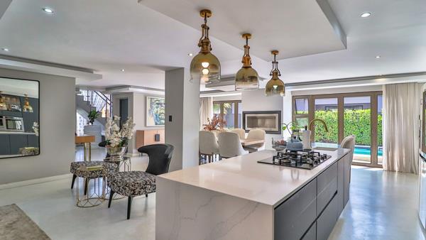 The ground floor features an open-plan design with a modern kitchen boasting elegant finishes and a scullery, flowing seamlessly into the dining and lounge areas.