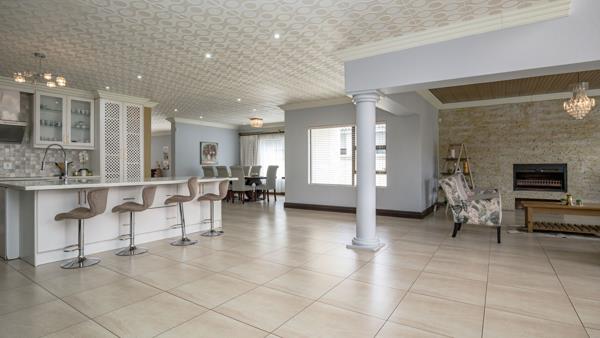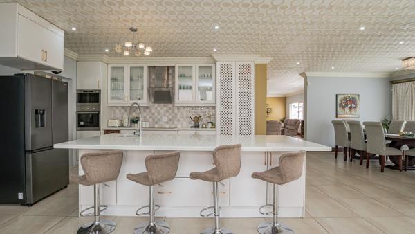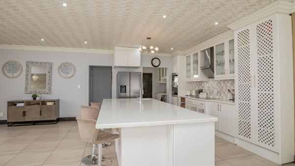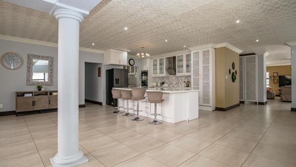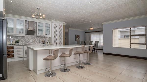 At the heart of the home is a stylish, well-appointed kitchen complete with ample cabinetry, quality countertops, and a separate scullery that keeps the main kitchen neat and functional. The kitchen flows effortlessly into the homes generous living spaces, making it ideal for both everyday living and entertaining.