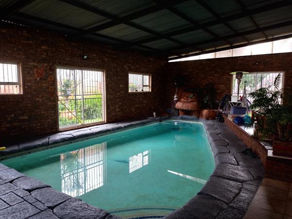In-house swimming pool for relaxation with rock-art waterfall and built-in braai.