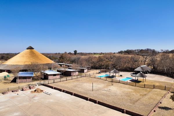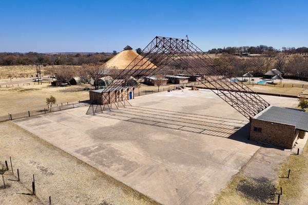 Immense thatch domed entertainment hall that forms the centre of the venue & can house very large gatherings, with an industrial kitchen, bar, thatched area for dishing meals, cloakrooms (with ladies and gents showers, basins and toilets), large movable stage, five large tented rooms divided into two rooms each, thirteen built rooms/sleeping halls with sliding doors, a large stand-alone bathroom facility with separate toilets, basins and showers for ladies and gents with a gas geyser on either side