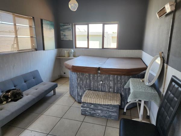 The covered entertainment patio, complete with a built-in braai, is ideal for outdoor entertaining, while the stunning pool beckons for leisurely afternoons and a luxurious Jacuzzi offers the ultimate relaxation experience.