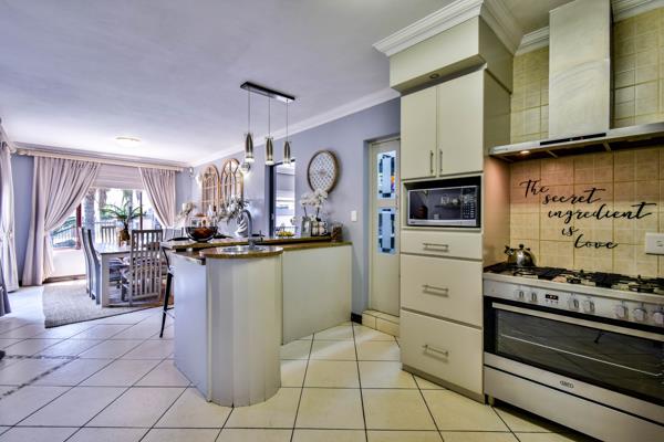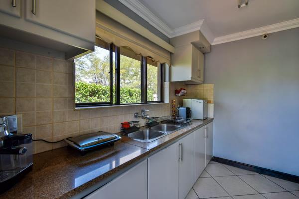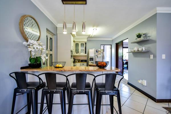 Downstairs, the open plan kitchen is a culinary dream, equipped with sleek granite countertops, high end finishes, and a separate scullery for added convenience. The expansive living areas seamlessly flow into a TV room, dining room, and an enclosed entertainment area, where a built-in braai and expansive doors offer the perfect setting for alfresco dining and relaxation.