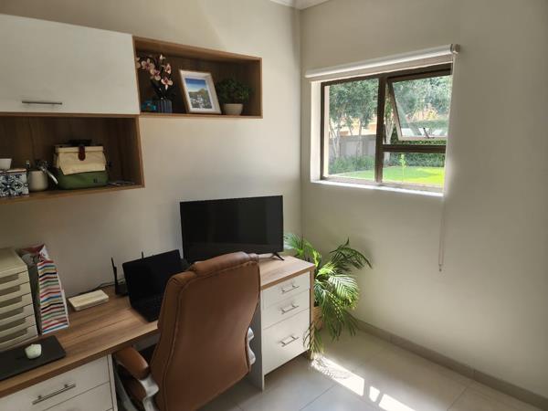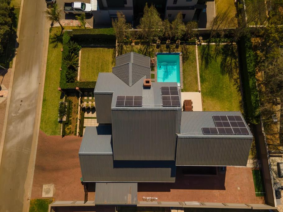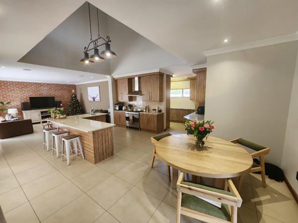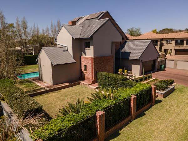 This exquisite double-storey home perfectly blends modern elegance with comfort and functionality. Boasting four spacious bedrooms with double-volume ceilings and three beautifully finished bathrooms, it offers a sense of openness and luxury throughout. A separate study provides the ideal space for working from home, while the pyjama lounge upstairs creates a cozy retreat for relaxation. The modern open-plan kitchen with a separate scullery flows seamlessly into the spacious living and dining areas, leading out to a covered entertainment patio with a built-in braaiperfect for hosting guests. Overlooking a sparkling pool and a stunning, landscaped garden, the outdoor area exudes serenity and privacy. Additional features include a double garage, double carport, and an outside room with its own bathroom, offering excellent versatility. The home is equipped with energy-efficient inverter aircons and a gas geyser, ensuring year-round comfort and reduced running costs. Set on a large stand in an excellent location close to green areas, this property provides breathtaking estate views, top-quality finishes, and the ideal balance of luxury, sustainability, and tranquillity.
