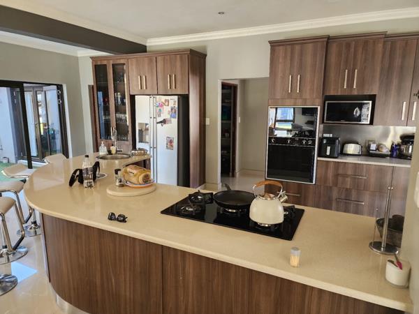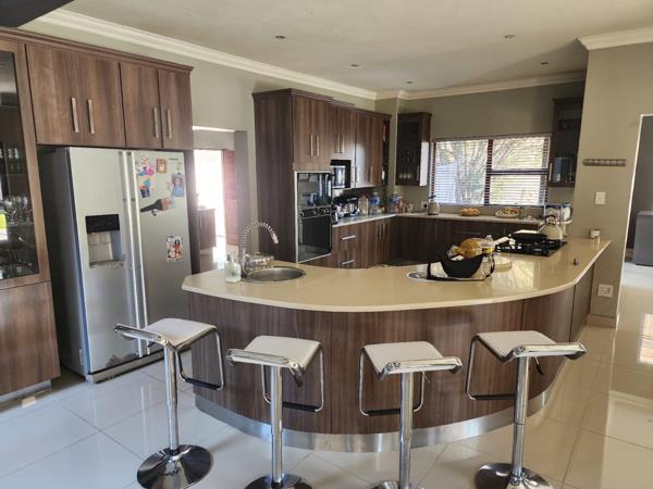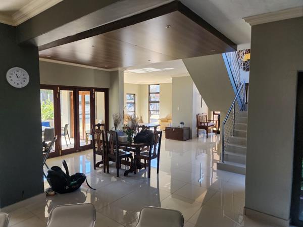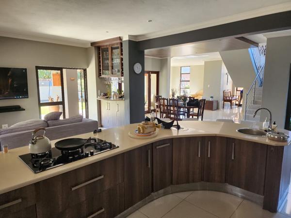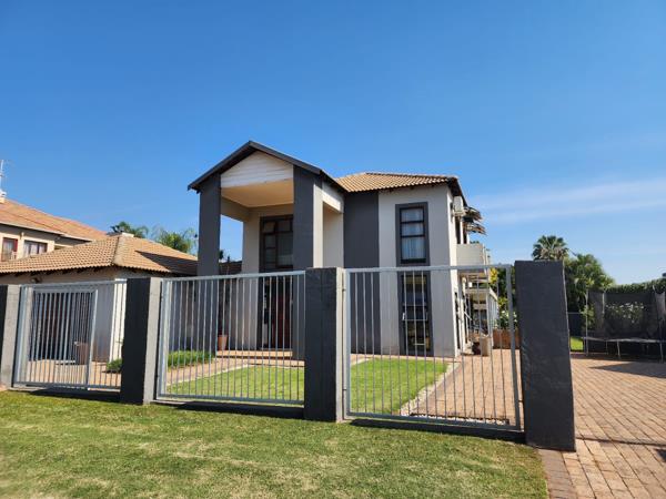 This stunning double-storey family home in the prestigious Zambezi Country Estate offers luxurious living spaces. With four spacious bedrooms, featuring two en-suite bathrooms and one additional bathroom, the rooms boast balconies offering breathtaking views. The open plan kitchen features sleek granite counter tops and a separate scullery for added convenience. The expansive living areas flow effortlessly onto a covered patio perfect for entertaining, complete with a built-in braai. The outdoor entertainment area features a cozy firepit boma and gourmet pizza oven, ideal for creating unforgettable memories. A separate outside room with its own bathroom provides comfortable accommodation for a domestic worker. Ample parking space and a double garage ensure that residents and guests can park with ease, providing convenience and peace of mind. Located close to green areas and shop, this property offers the ultimate blend of luxury, comfort and lifestyle convenience, making it an idyllic haven for families and entertainers alike.