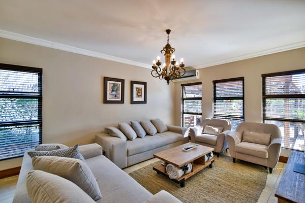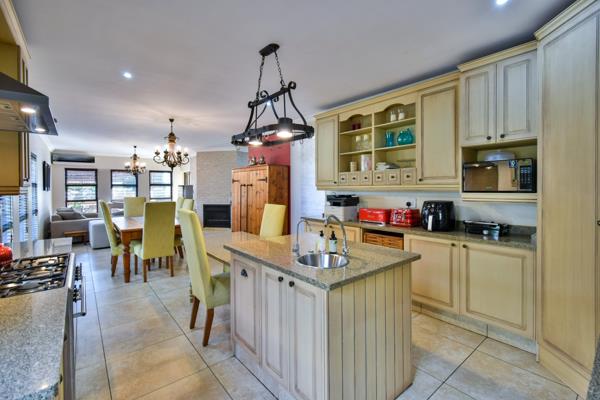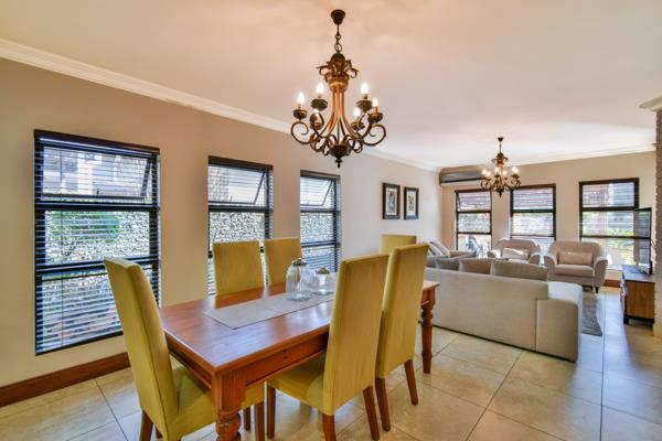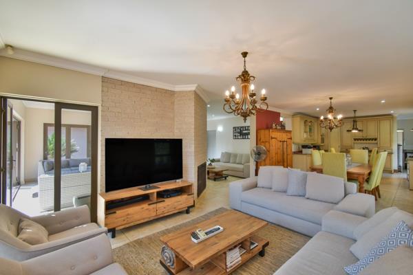 The open plan living areas seamlessy flow into a covered patio, ideal for alfresco dining and braai-ing. A sparkling pool and spacious landscaped garden complete with a fire pit boma creates the ultimate entertainment haven.
